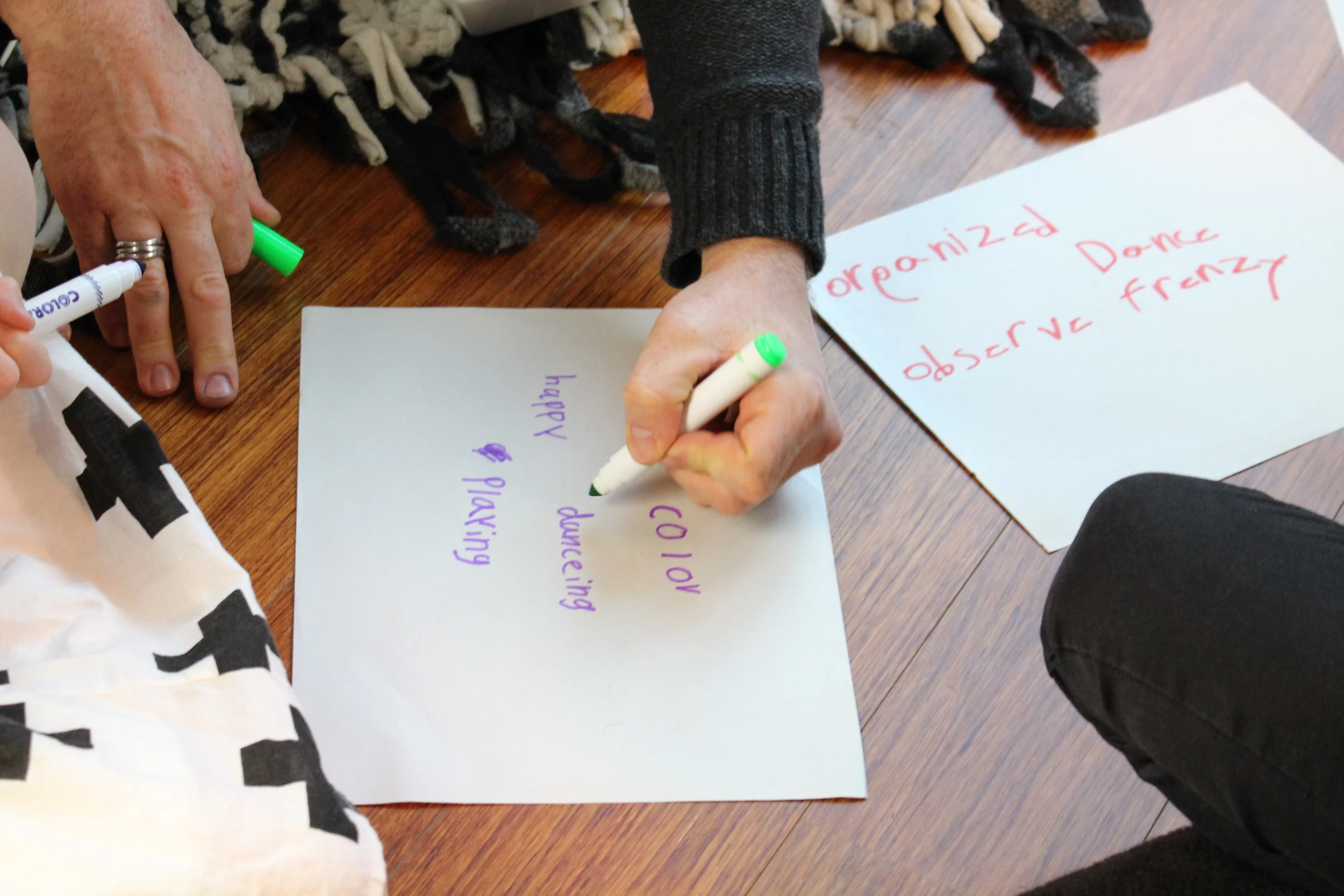 Once we spent time figuring out how the shapes will work together, we used a glue stick to glue them onto the original piece of construction paper (which should now be dry). Finally, we selected two or three interesting words. We wrote them down using bold, bright, colorful lettering. We cut out the words and glued them to our piece of art. We suggested having the kids use three words to describe themselves. We like action words or words that had energy to reinforce the idea of city life and jazz, but they can use any words they want.