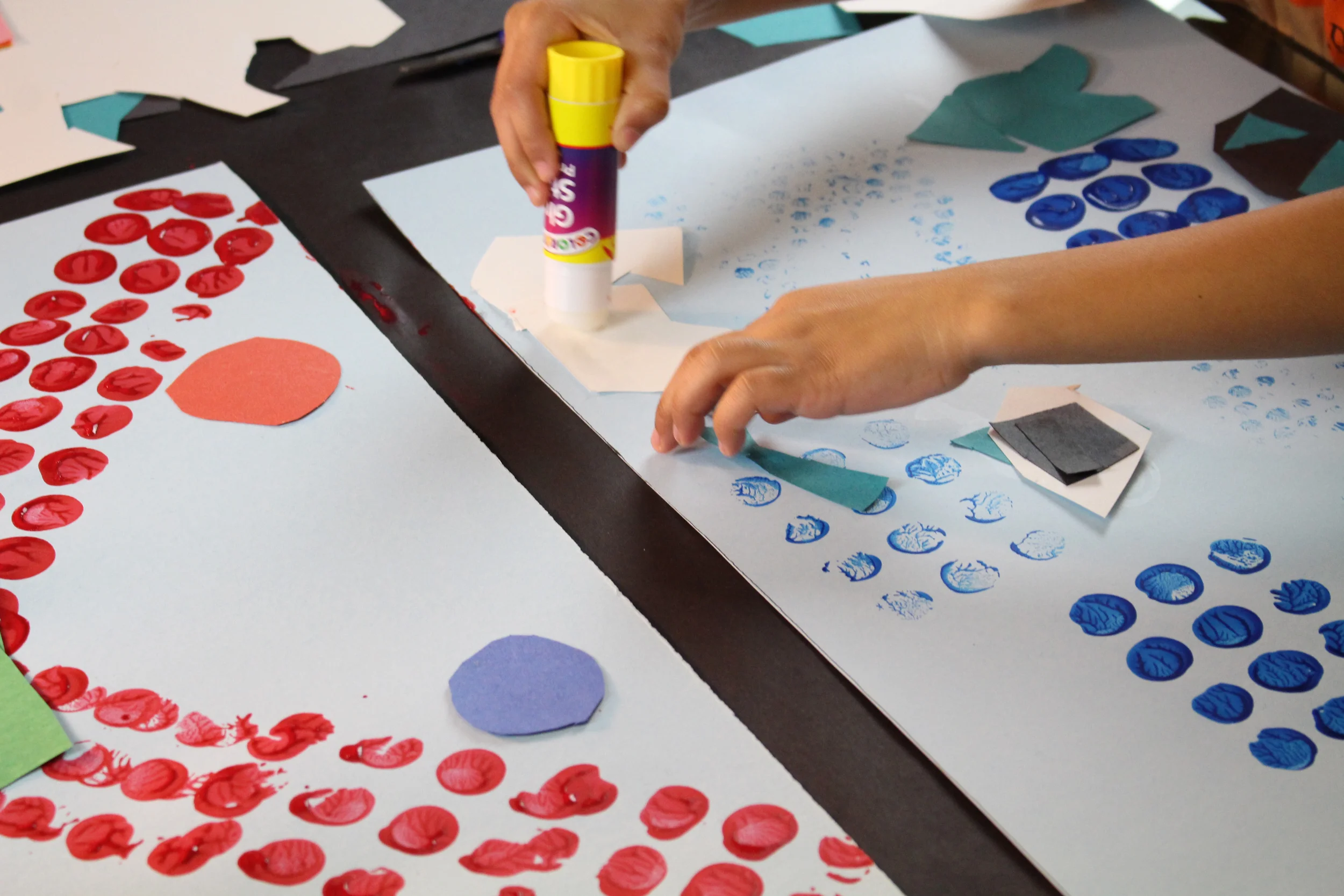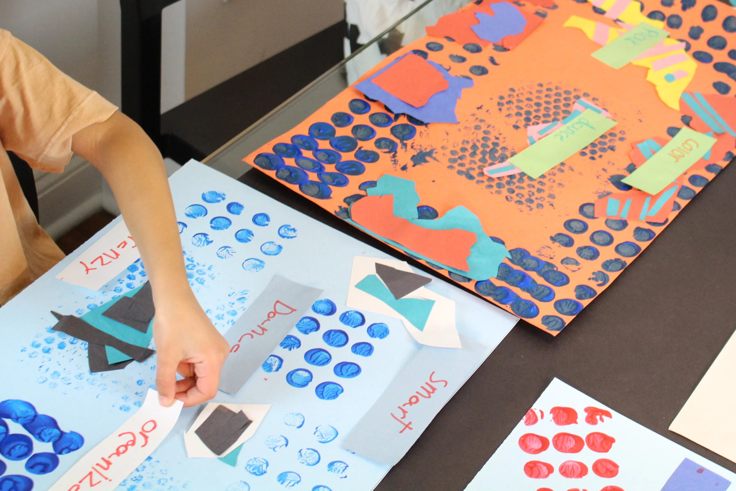 Since Davis was inspired by jazz, we played vintage jazz music from the 20’s and 30’s during the lesson and project. Bringing in the use of other senses often inspires kids and adds another level of authenticity to their creations. Though Davis was a painter, we did the project with colored construction paper as it was cleaner and easier to do at home. We selected a color of brightly-colored construction paper. Using a contrasting paint, we printed on top of the construction paper with either a circular stamper - we used the base to a glue stick container - or bubble wrap. (We love finding old items from around the office to “upcylce” for our projects.) Mimicking the pop-art movement, we stamped dotted patterns onto the paper as desired without any “organized” stamping. Once this step is done, we set the construction paper aside to dry.