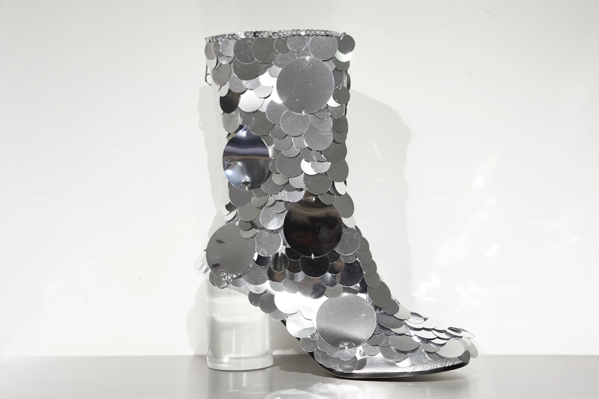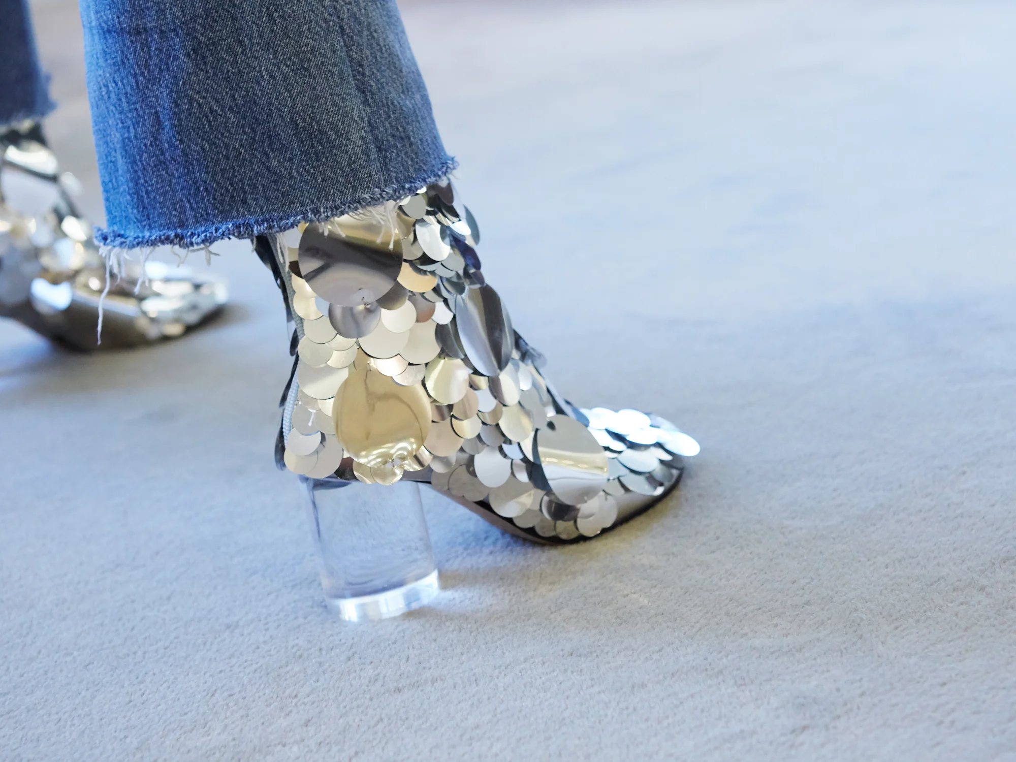 “The silver sequin bootie is probably the most fun, comfortable boot this season and surprisingly versatile as well because of the clear plexi heel.”