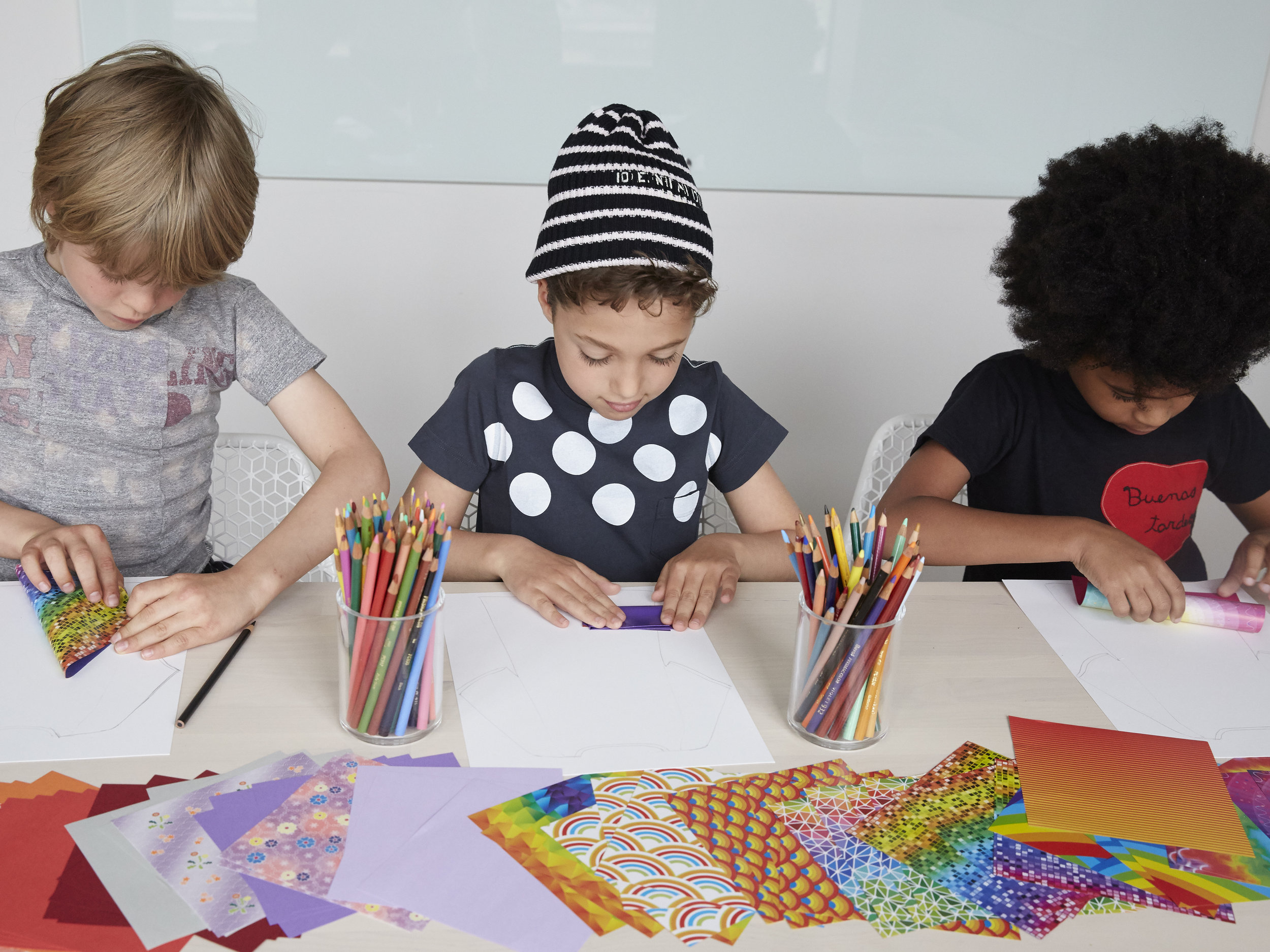 With only guidance, a little direction, and some questions, we were able to allow the boys to really get into the process. When they settled on placement for their paper and embellishments, we came in with a hot glue gun to attach.