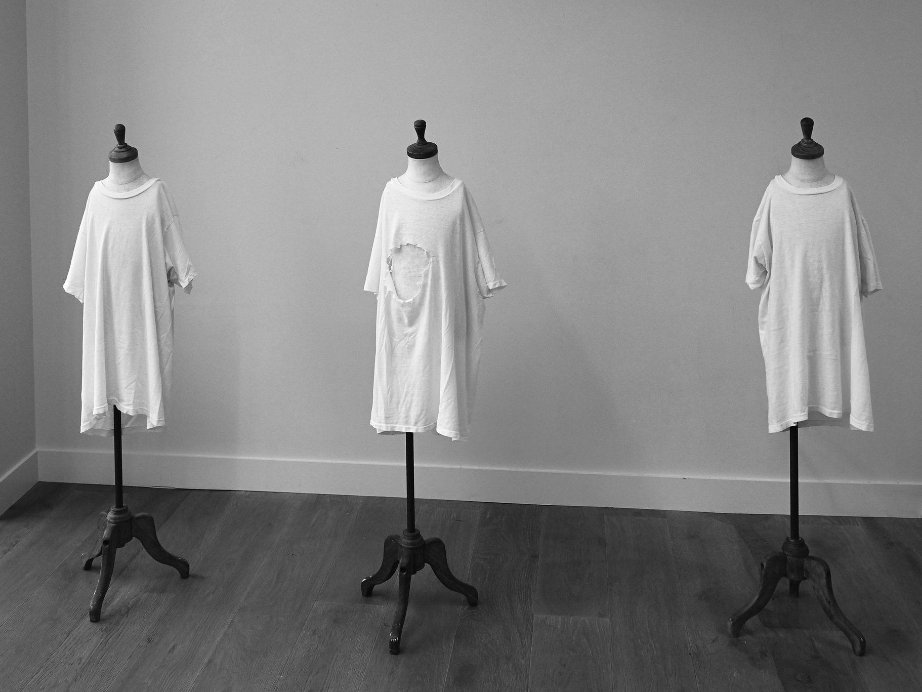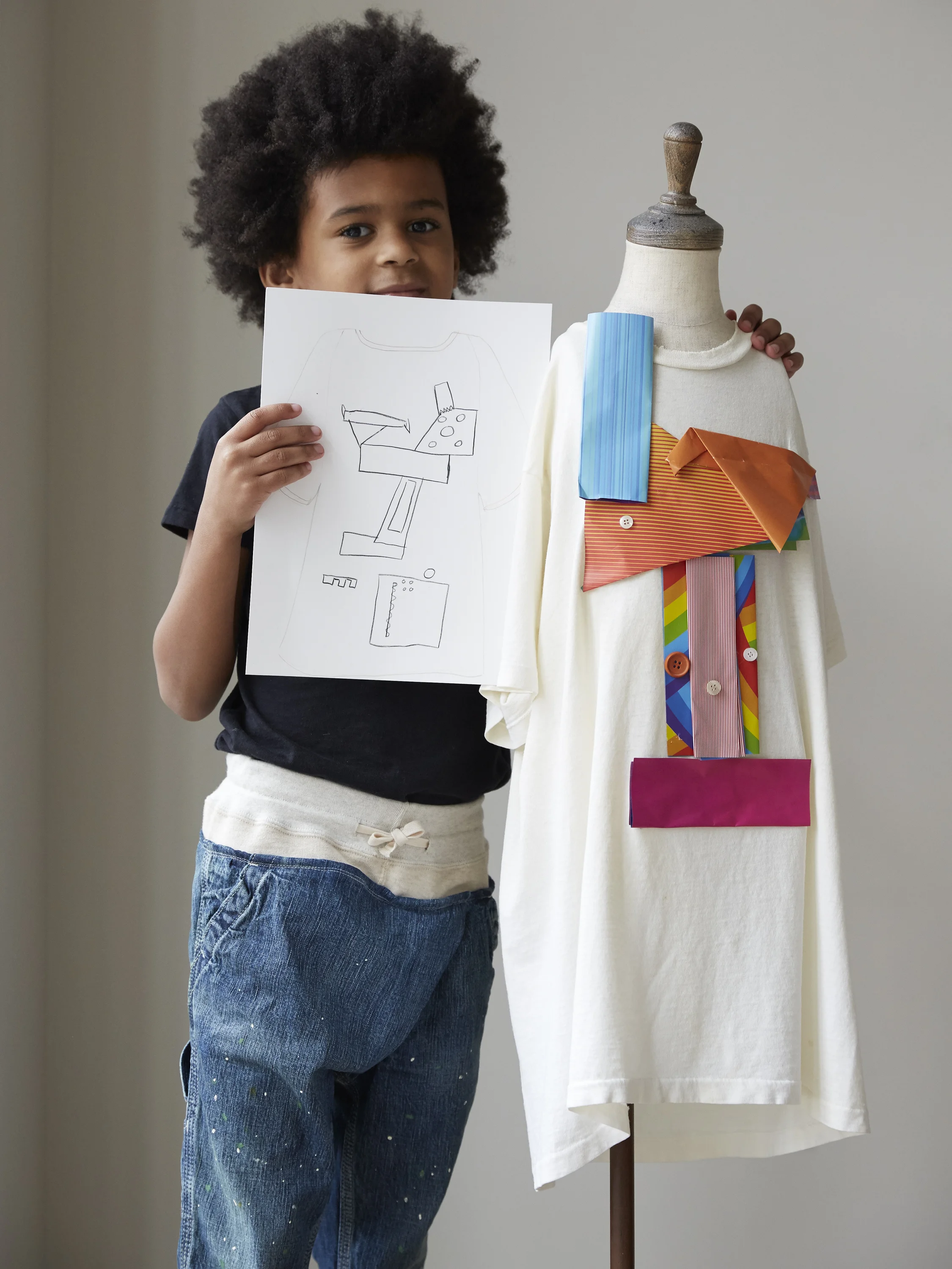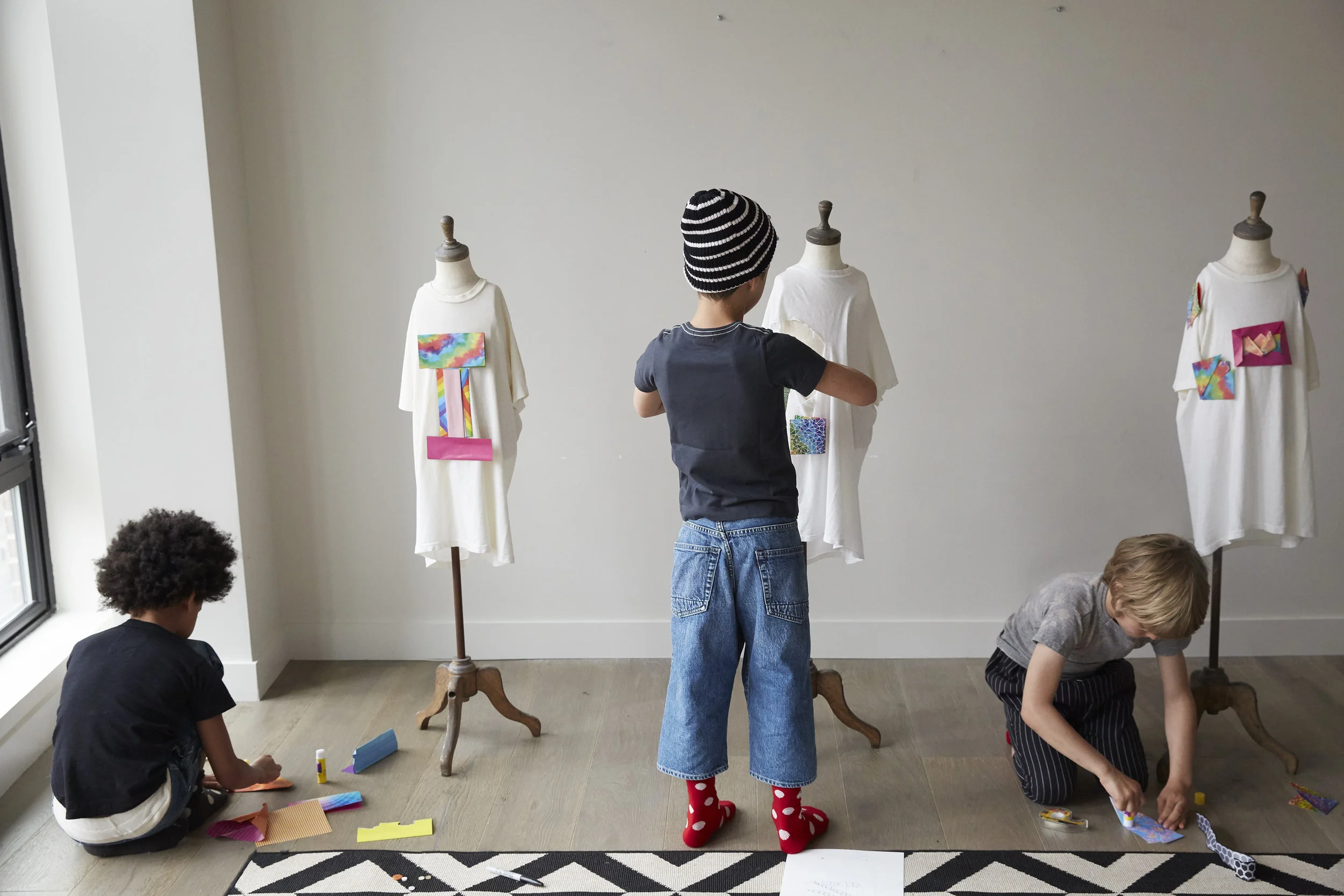 We told the boys they were going to design a garment using the distressed vintage t-shirts on the mannequins. Since CDG is a Japanese label, origami paper is the perfect material to construct