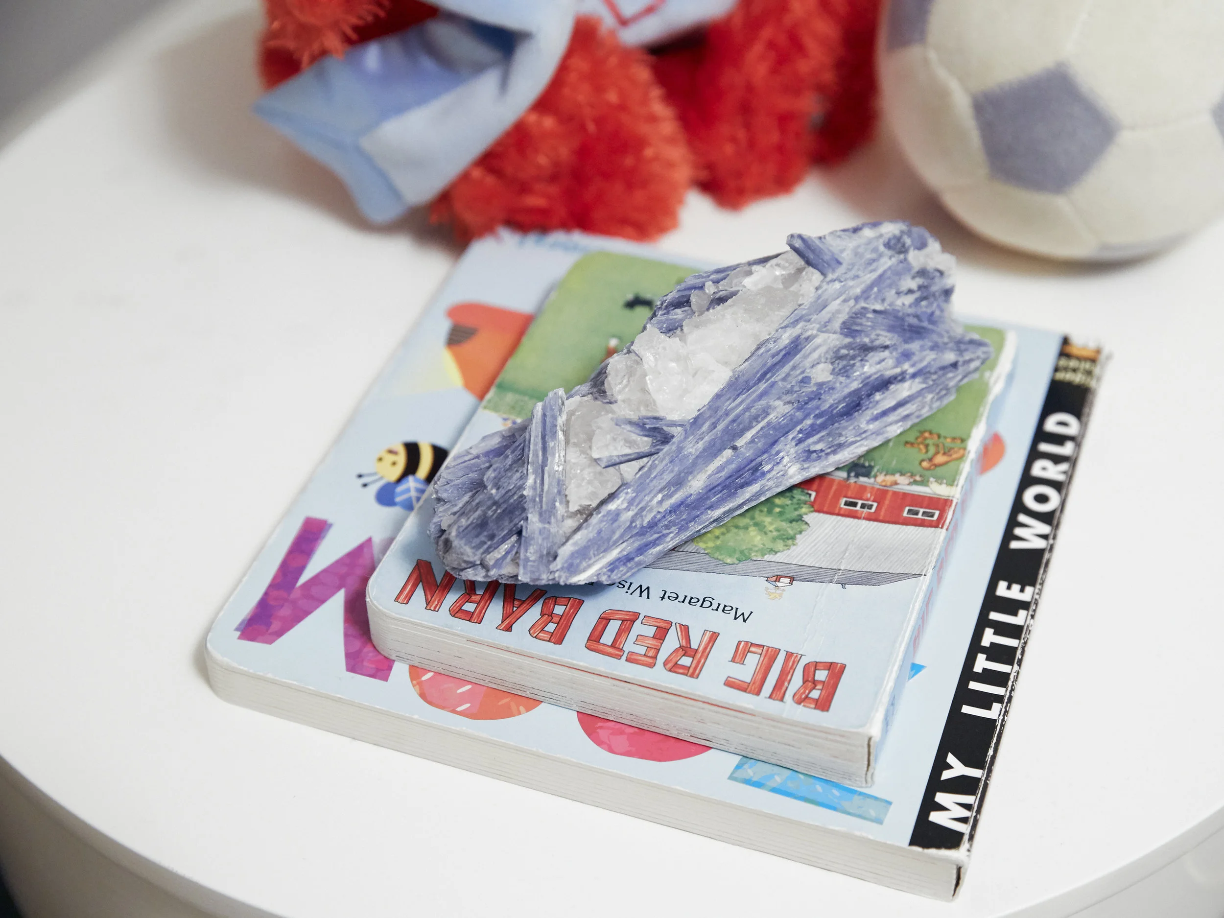 We chose this blue kyanite for a young child’s room because it is a very nurturing stone that enhances communication and expression to support development and learning. It is a great stone for children as they learn to read and articulate themselves.