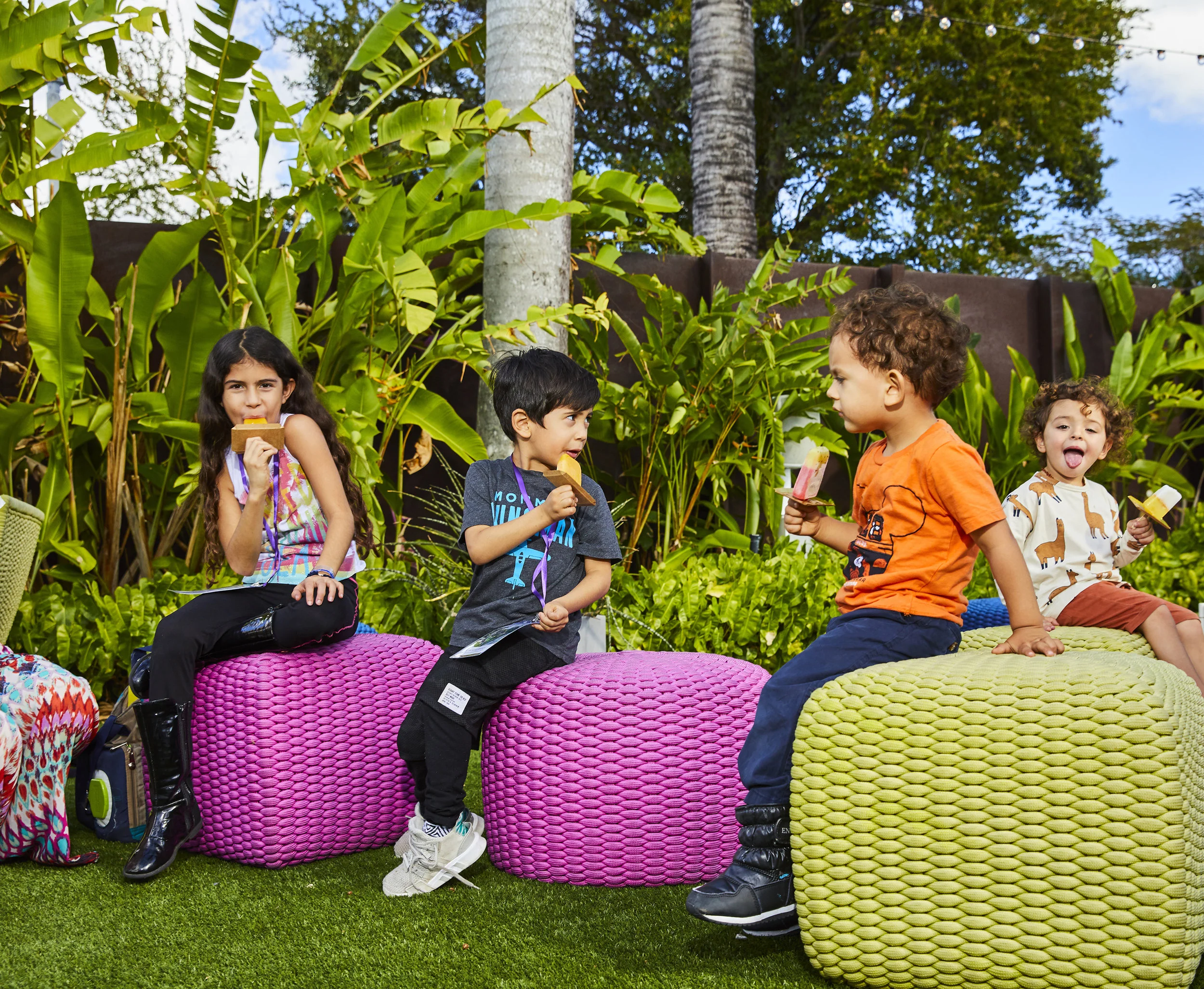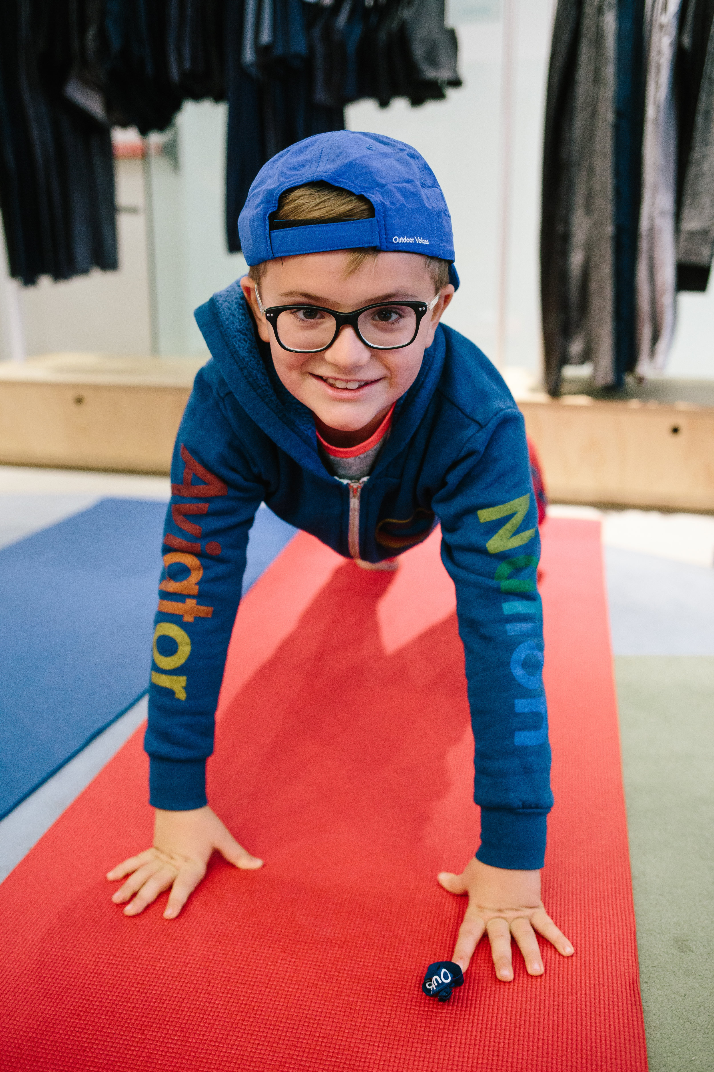 So on a recent Sunday we decamped to the Outdoor Voices boutique on the Upper East Side for a fun kiddo yoga sesh. It was the perfect setting, as not only does OV promote #doingthings at all ages, but it’s all about the magic of movement with friends. As mamas snacked on popcorn and Detox and Energy bars by Sakara and sipped on Dirty Lemon Ginseng and Matcha juices (cuz, it’s Sunday morning), Eda began the yoga practice. She started with a group Om before leading the children into a Sun Dance. They also practiced breathing exercises, and she showed them eagle, tree, airplane and group flower poses, as well as Warrior 1, 2 and 3. “The kids were very receptive to the tools I taught,” Eda said. “I’ve been teaching kids for two years and every class is so different. I quickly learned that while it is good to have a structured lesson plan, you may have to shift and change the class based on the energy of the group. This keeps me on my toes and really trains me to be present.”