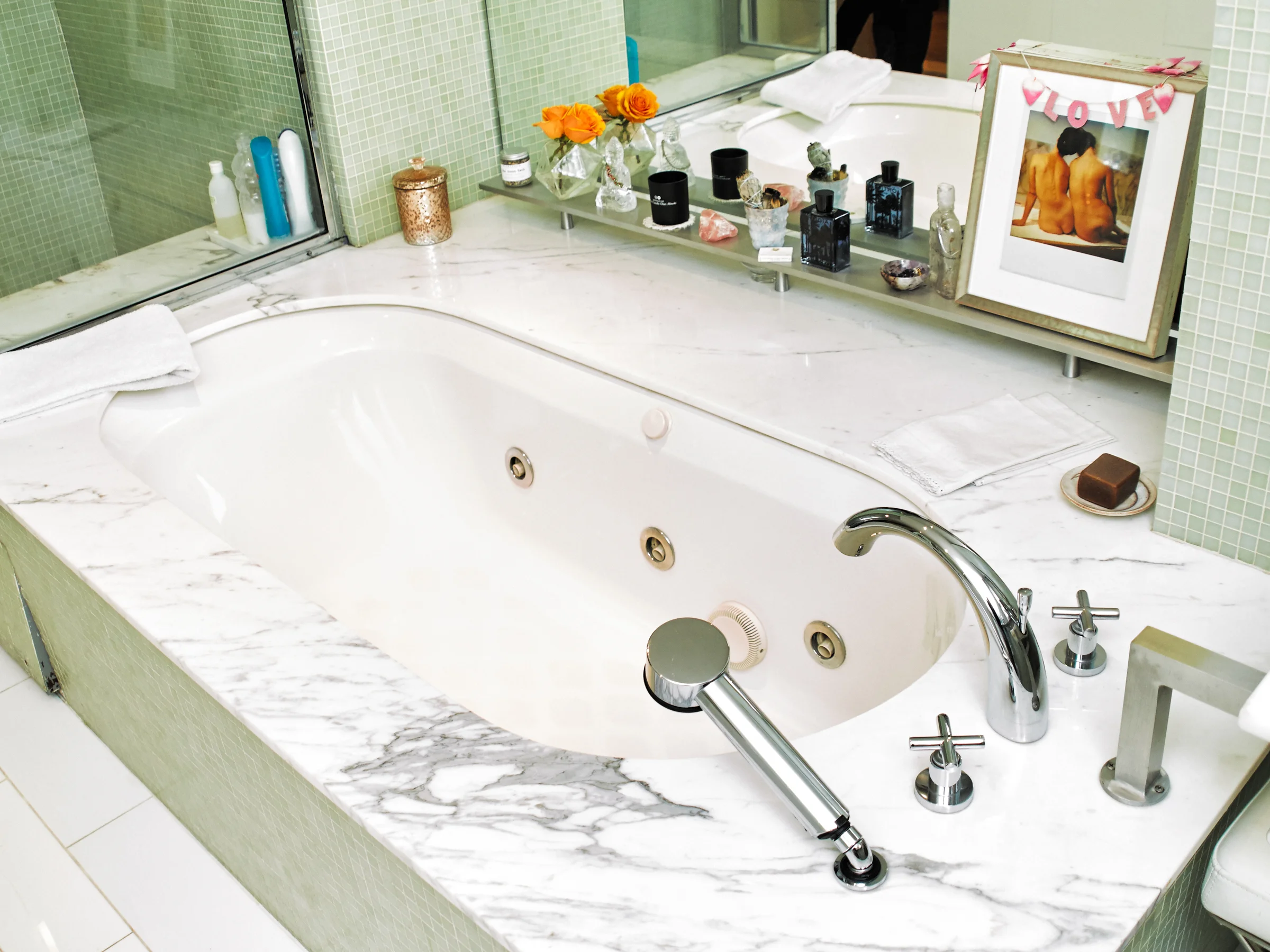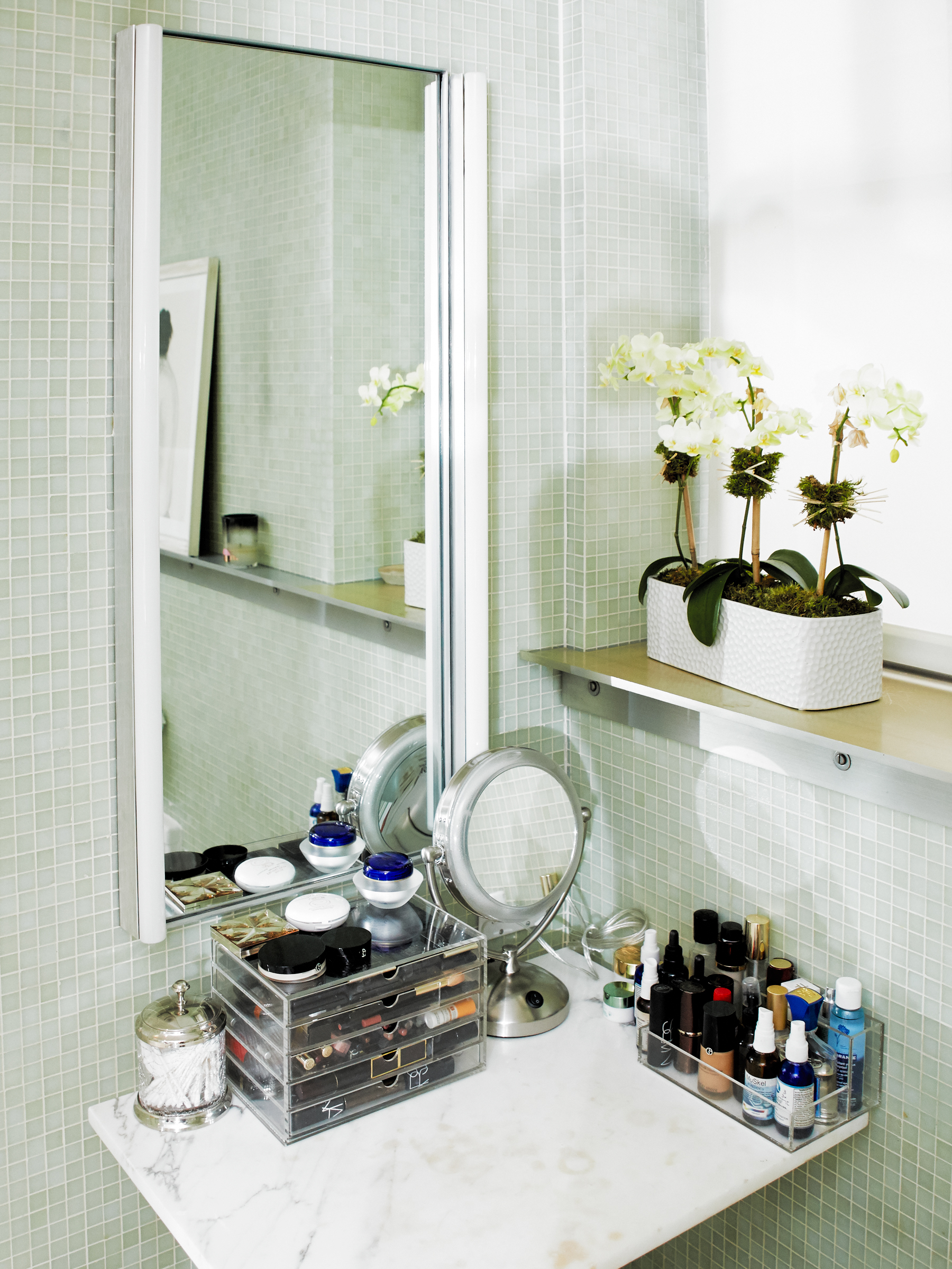My bathroom is my sanctuary of beauty, where spa-like colors of light ocean green mix with white marble that signal cleanliness and purity. In it, I keep my favorite candles, crystals and bath oils that are carefully and intuitively placed around my bathroom.