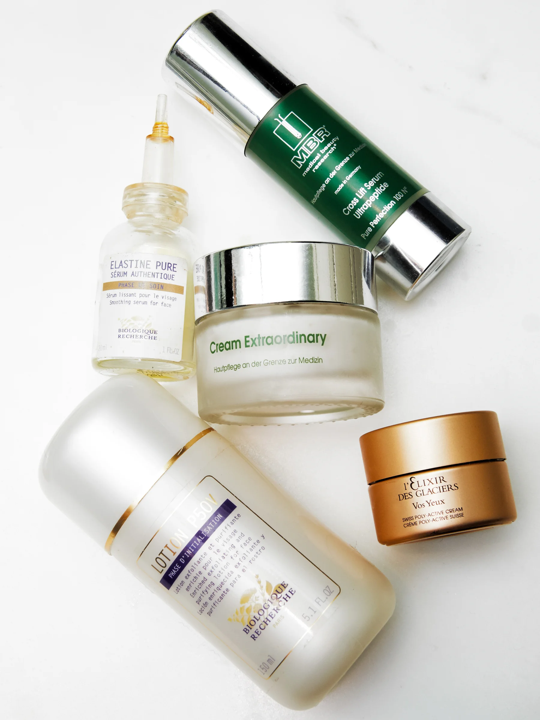Cross Lift Serum Ultrapeptide by MBR | Cream Extraordinary by MBR | L'Elixir des Glaciers Vos Yeux Eye Treatment by Valmont | Lotion P50V by Biologique Recherche | Elastine Pure Serum Authentique by Biologique Recherche